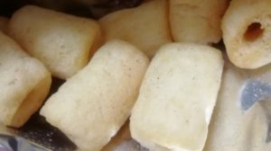 ミニサイズのうまい棒的なものを一口サイズに切ったような形ですね。