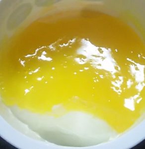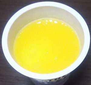 開けた瞬間はオレンジゼリーのようなかんじですが、これがパイナップル果肉・マンゴー・グァバピューレ・パッションフルーツ・ライチ果汁の5つを組み合わせた上乗せソースですね。
